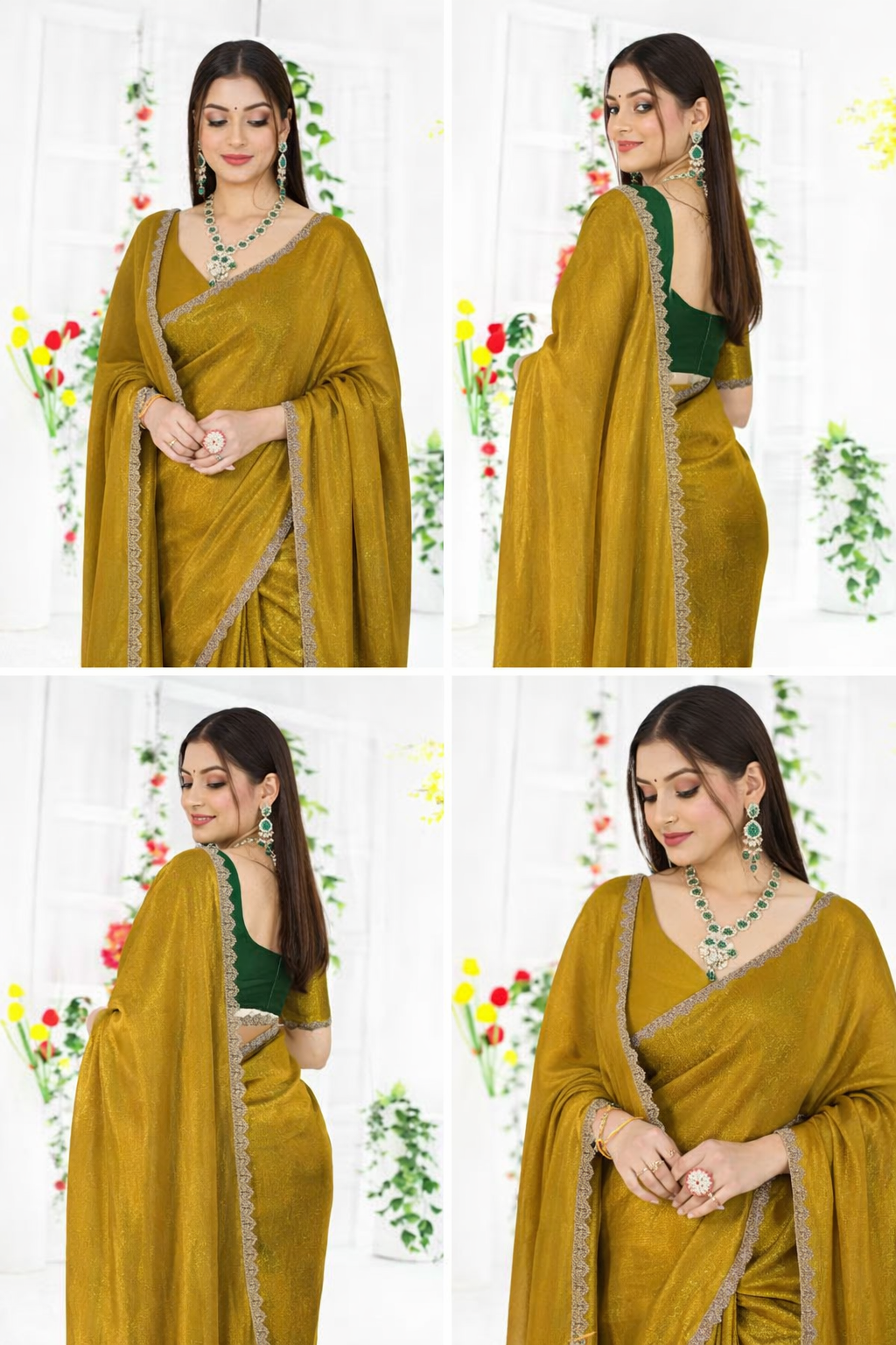 This stunning gold and Rama green two-tone saree is a masterpiece of elegance and luxury, perfect for weddings, festive celebrations, and grand gatherings. Crafted from soft fancy chiffon silk, it drapes beautifully, offering a lightweight and flowy texture that enhances your grace and charm.
